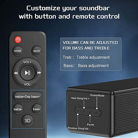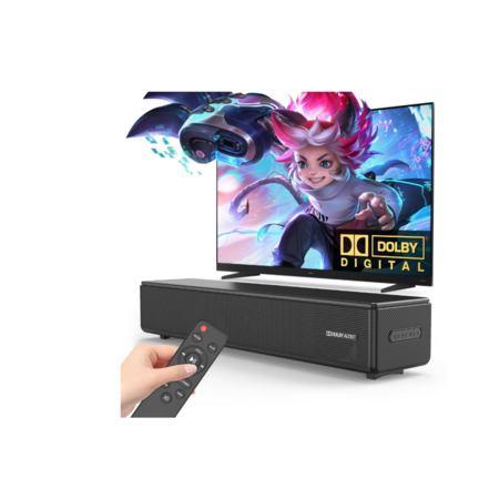 Discover the ultimate audio experience with the Dolby Digital Soundbar. With a peak power of 200W and robust connectivity options including HDMI-ARC, Optical, USB, AUX, and Bluetooth 5.3, this soundbar ensures stable and high-quality sound transmission. Equipped with two dedicated subwoofers, it delivers deep, rich lows and an immersive 3D sound effect that brings your entertainment to life. 【Tips】When connecting to a TV via HDMI, please make sure the TV's Digital Audio Format is set to 'AUTO' or 'PCM'. To get high-fidelity Dolby audio, please turn on eARC in the TV's HDMI settings. 【Dolby Soundbar】Featuring with Dolby Digital technology, our soundbar offers an immersive and rich audio experience for all your entertainment needs. 【All-In-One Design】Built-in two 50W speakers and 2 diaphragms, delivering a peak power of 200W and robust subwoofer effects for an immersive audio experience. 【Wireless Bluetooth 5.3】The latest Bluetooth 5.3 ensures stable and efficient connections to smart devices, allowing you to stream your favorite content seamlessly. 【Bass and Treble Adjustable】Equipped with 3 EQ modes, the soundbar lets you customize the bass and treble to suit your preferences. 【Multiple Connectivity Options】HDMI, Optical, and AUX inputs make it easy to connect the soundbar for TV to various devices like TVs, PCs, and gaming consoles, ensuring a simple and convenient setup. 【What's Included】 1* Sound Bar 1* Remote Control (2 AAA Batteries Not Included) 1* DC Adapter 1* Aux Cable 1* HDMI ARC cable 1* Optical Cable 【Specifications】 Package Size : 17.16 x 6.05 x 4.17 inch Weight : 4.9lbs Power : 100W Peak Power: 200W (RMS x 2) EQ Modes: GAME, NEWS, MUSIC, MOVIE Bluetooth : 5.3 Support : Bluetooth、AUX、OPTICAL、Coaxial (Not Included)、USB Our soundbar is compatible with common brand TVs. If you have any problems connecting to your TV, please contact us at