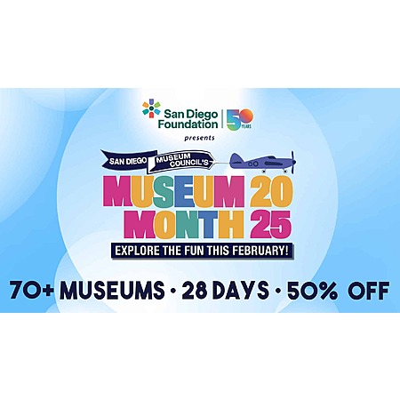 San Diego Museum Council is running San Diego Museum Month 2026 [sandiegomuseumcouncil.org] where starting February 1, you can download a digital pass to your mobile device. If you are in or near San Diego, you may visit any of their City or County public libraries to pick up a prited pass. Present your pass this February for half-price admission for up to 4 people at 70+ museums around San Diego County from February 1 -28, 2026. Some restrictions apply*