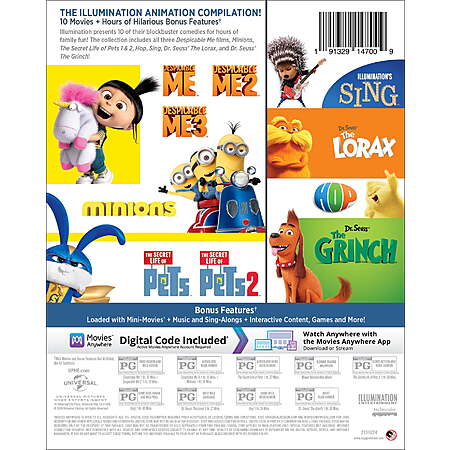 Illumination presents all ten of their blockbuster comedies in one collection for the whole family. Includes all three Despicable Me films, The Secret life of Pets 1 & 2, Hop, Minions, Sing, The Lorax, and The Grinch!
