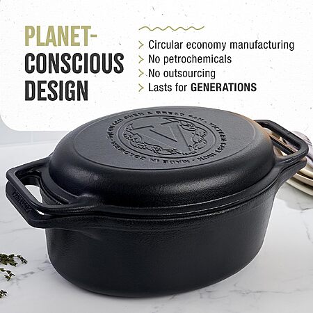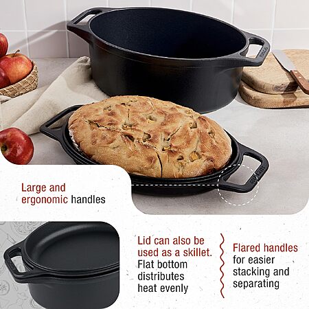 • CAST IRON COOKING: Our Cast Iron Oval Dutch Oven and skillet have a preseasoned skin that builds seasoning with each use and offers an easier release. This cast iron set is seasoned with non-GMO, kosher-certified flaxseed oil and is PTFE- and PFOA-free.