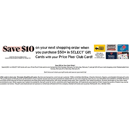 ShopRite Supermarkets [shoprite.com] has a promotion to save $10 off your next shopping order when you purchase $50 in SELECT Gift Cards with your Price Plus Club Card. This promo is also on the page 6 of the