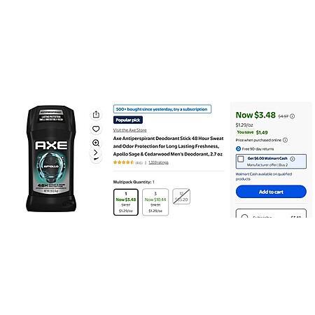 $6 WM Cash + 2 x Axe Antiperspirant Deodorant Stick 48 Hour Sweat Apollo Sage & Cedarwood 2.7 oz YMMV $6.96