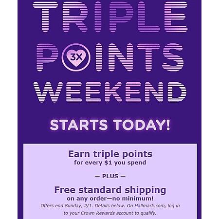Offers end Sunday, 2/1. Details below. On Hallmark.com, log in to your Crown Rewards account to qualify.
