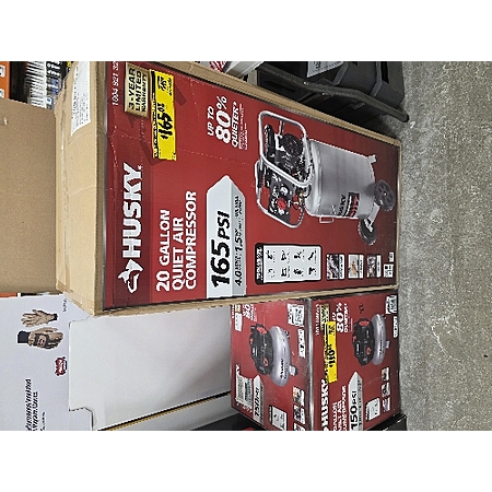 This Husky 20 Gal. Vertical Electric Air Compressor delivers 4.0 SCFM at 90 psi with a big capacity and power yet with small noise less than 73 dBA but long life time up to 1000-hours. Its 8 in. rubber wheels, 6 ft. cord and rubber-reinforced grip provide easy mobility around the shop, garage or on a worksite. Its vertical design takes up less space for storage and it is powerful enough for the toughest grease gun, drills, hammer, finish nailer, framing nailer, impact wrench, rachet and spray gun projects, while the oil free electric motor needs less mess and maintenance. The metal control panel with a big regulator knob, 2 metal case gauges, 2 quick couplers can help with an easy operation and the reinforced frame can well protect the pump/motor from damage. 2 quick couplers allow 2 tools work simultaneously