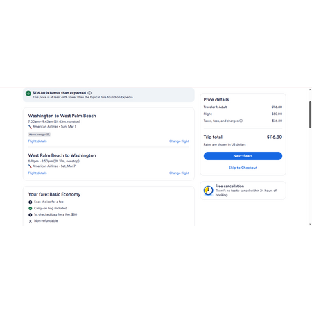 JetBlue, American Airlines and Expedia have round trip airfares travelling to and from West Palm Beach FL (PBI) and Washington DC (DCA) for $117, nonstop. These are basic economy fares that allow a personal item and a carry-on bag. There is no seat selection and no change. If you are travelling with children, you will be seated together as per JetBlue and AA's policy.