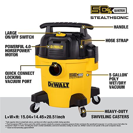 DEWALT 5 Gallon STEALTHSONIC Ultra-Quiet Wet/Dry Shop Vac, 4 Peak HP Portable Vacuum DXV05P-QT $128