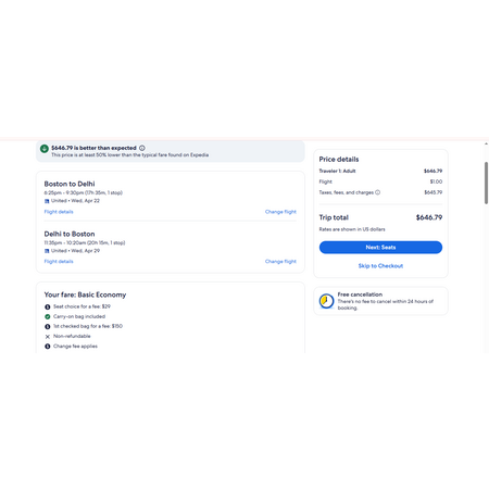United Airlines and Expedia have round trip airfares travelling from Boston (BOS) to New Delhi India (DEL) for $647-$655, making 1 stop both ways in New Jersey. These are basic economy fares that allow a personal item and a carry-on bag. There is no seat selection, no changes and no free checked bag unless you are a primary United Chase cardholder. There are limited dates and even less for returns so don't wait on this because once that allotted number of seat sold at this price is gone, the price goes up.