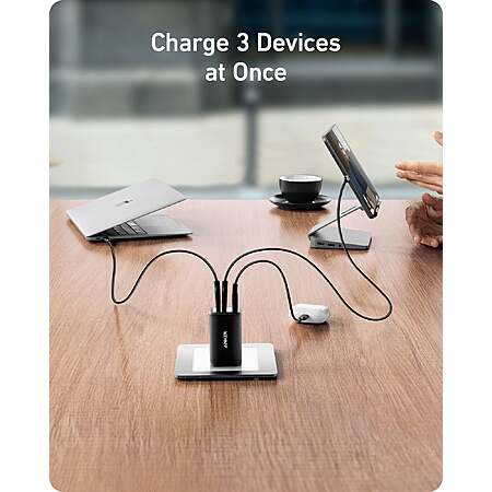 - 3‑port layout (2× USB‑C + 1× USB‑A) supports multiple devices at once.