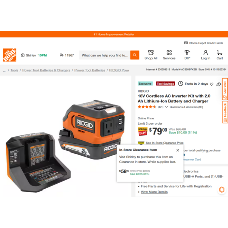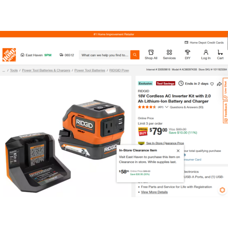 YMMV - Select Home Depot Stores: RIDGID 18V Cordless AC Inverter Kit with 2.0 Ah Lithium-Ion Battery and Charger $58.05