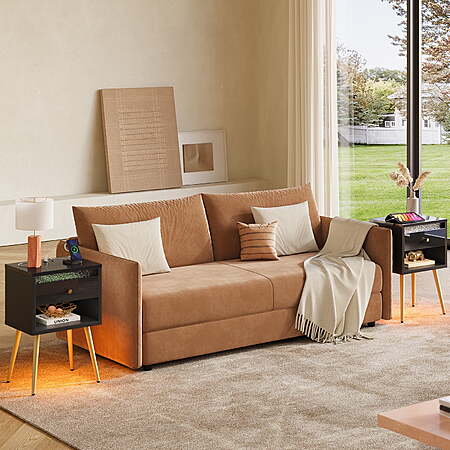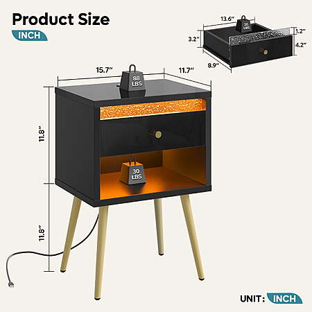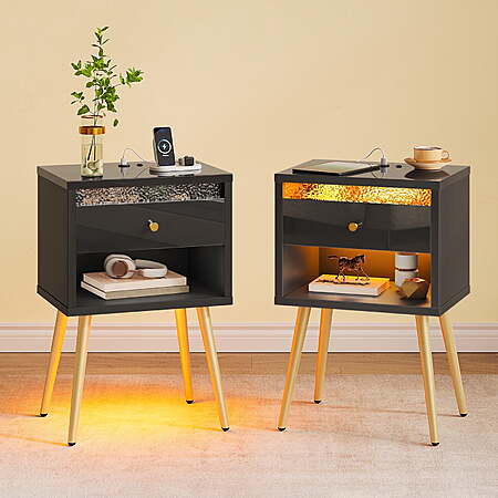| Product Description: | Pinmoco Set of 2 LED Nightstand with Charging Station, Modern Bedside Table with Drawer and Open Storage Crafted from P2-grade particle board and supported by sturdy metal legs, guarantees stability and bids farewell to wobbly furniture. This simple yet exquisite bedside table features a classic black and white color scheme combined with matte gold legs, offering a modern and stylish look, allowing this bedside table to blend perfectly with any decor. Our bedside table is not only suitable for the bedroom, but also for the living room or balcony as a coffee table. Imagine sitting next to the simple cabinet on a relaxing afternoon or evening, enjoying a cup of coffee. How a nice day! Pinmoco Set of 2 LED Nightstand with Charging Station, Modern Bedside Table with Drawer and Open Storage for Bedroom, Black Simple Modern Design: The top of the bedside table and the front panel of the drawer have a high gloss finish,and the light luxury metal handle bring a perfect visual effect. The high gloss panel and water ripple design of the drawer enhance elegance to home life.Bring this stylish night stand into your home and enjoy its beauty and functionality for years to come. Sturdy and Durable: P2-grade particle board and modern metal give you triple the texture. The nightstand is wear resistant and waterproof, ensure a long service life. The base is supported by four metal feet for great stability. The bottom anti-slip rubber pads can prevent the floor from scratches and reduce noises when being moved. Multi-Function Storage Space: The bedside table features private drawers and open storage design providing ample space to tuck away books, diaries, glasses, tea set, or private essentials.keep your space tidy.The wide top is perfect for displaying a lamp, clock, potted plant or photo frame to offer warmth and personalized decoration. Built in Charging Station: Our night table has SB and Type-C charging ports, providing convenient and portable charging options for your mobile devices. Enjoy playing with your phone or tablet comfortably in bed no need to look around it's within your arm's reach. DIY LED Light:The LED strip for the bedside table can be installed in two ways; you can freely choose to install it either under the drawer or at the bottom of the cabinet. Installing the LED strip under the drawer provides soft lighting inside the drawer, making it easier to find items at night or in low-light conditions. Installing the LED strip at the bottom of the bedside table can add ambient lighting to the entire room. Multiple Uses Applications: Our end table is versatile enough to fit in any area of your home. Whether you require a bedside table for the bedroom, a handy side table next to your sofa, this nightstand serves as an ideal choice. Its multifunctional design opens up a world of possibilities. Easy to Assemble: With all labeled parts, tools and a step-by-step installation manual included in the package, you can easily assemble this stunning nightstand in 30-40 minutes. |