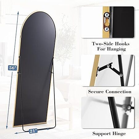 Model: DUMOS Arched Full Length Mirror with Stand Floor Standing Aluminum Frame for Bedroom Body Hanging Leaning Modern Simple Home Decor Shatter-Proorf Nano Glass Wall Living Room Cloakroom Gold 56"x15"