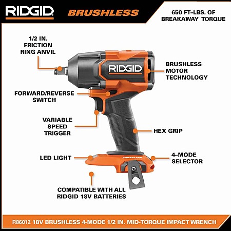 RIDGID 18V Brushless Cordless 1/2 in. Impact Wrench Kit with 4.0 Ah Battery and Charger, $109, FS, Home Depot
