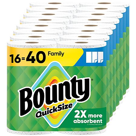 Bounty Paper Towels Quick Size, White, 16 Family Rolls = 40 Regular Rolls x 2 packs $78.28 or less Clip Q, S&S, Get $20 Amazon Credit and $15 Visa Rebate