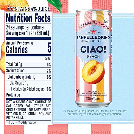 Model: Sanpellegrino CIAO Peach Sparkling Water, Low-Calorie Italian Sparkling Water with Real Fruit Juices, 0g Added Sugar, 24-Pack