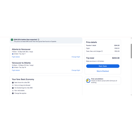 United Airlines and Expedia have round trip airfares travelling from Atlanta (ATL) to Vancouver British Columbia Canada (YVR) for $245, making 1 stop both ways. These are basic economy fares that include a personal item. There is no seat selection, no carry-on bag and no change. If you are travelling with children, you will be seated together as per the airline's policy.