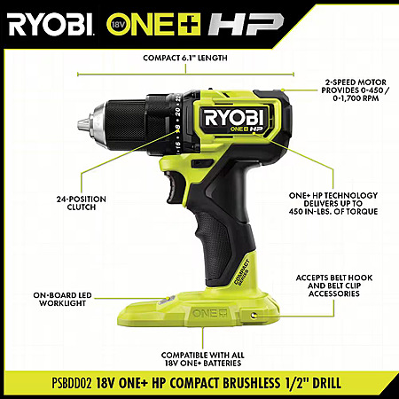 ONE+ HP 18V Brushless Cordless Compact Drill/Driver Kit with 18V 2.0 Ah HIGH PERFORMANCE Battery and Charger $52