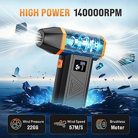 Powerful Performance: Features a 140000 RPM brushless motor, delivering up to 57m/s wind speed and 220G blowing force for efficient dust removal.