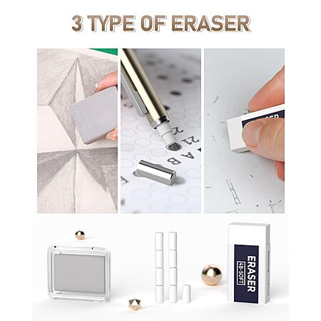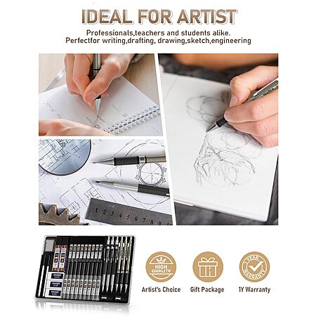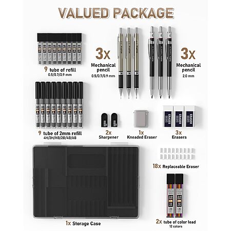 35PCS Upgraded Version Artist Set:Come with 6 PCS drafting pencils and 20 tubes of lead refill in 0.5 mm & 0.7mm & 0.9mm & 2.0 mm, 3 pcs 4B erasers, 1 pcs kneaded eraser, 18 pcs cap eraser refills, 2 pcs lead sharpener, a storage case.