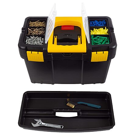 - PRODUCT DETAILS - Materials: Plastic. Dimensions: (L) 10" x (W) 17.875" x (H) 24.125"; Top Tool Organizer: (L) 9.875" x (W) 17.75" x (H) 11.5"; Bottom Storage Compartment: (L) 10.25" x (W) 17.75" x (H) 12.75". Color: Black and Yellow.