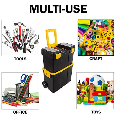 - PLASTIC TOOL BOX ON WHEELS - This set of two stackable tool organizers includes a traditional tool chest and a deep-bottomed storage compartment that latch together or can be used separately with plenty of room for all your essential tools and supplies.
