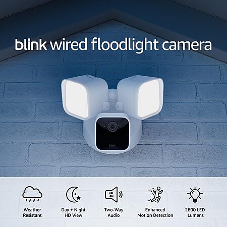 Amazon.com has Blink Wired Floodlight Camera, Smart security camera, 2600 lumens, HD live view, enhanced motion detection, built-in siren, Works with Alexa, 1 camera (White) on sale for $44.99. Shipping is Free.