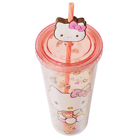 - SANRIO HELLO KITTY COLD CUP: This cold cup features Hello Kitty holding an adorable jar. Surrounding this Kawaii character are an assortment of miniature drawings depicting apples, cinnamon, bows, and hearts. Cold cup is complete with a pink striped straw and straw topper which illustrates Hello Kitty's face.