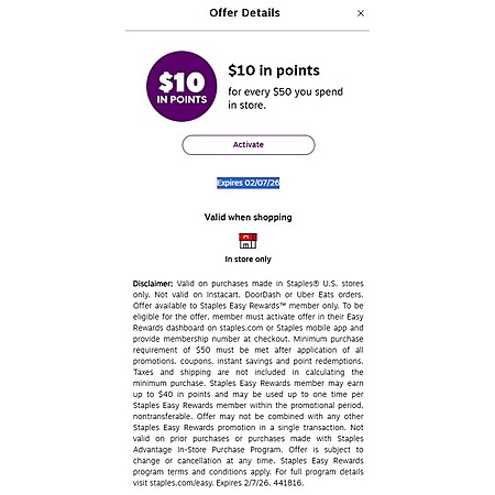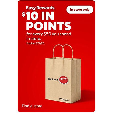 At Staples - $10 in points for every $50 you spend in store. From 2/1/206-02/07/26