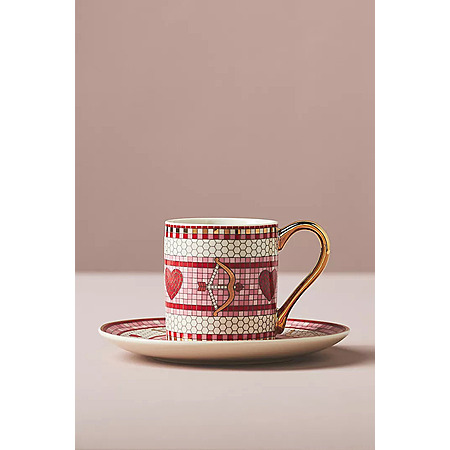Anthropologie The Bistro Tile Stoneware Espresso Cup & Saucer: Valentine's Edition, Bow & Arrow or Bisous $14
