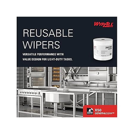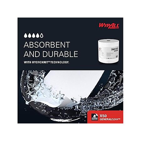 WypAll® is the number one brand of disposable wipes in the US and Canada. Create a clean work environment with light to medium duty general cleaning solutions. When economy and function top your list of priorities, WypAll® GeneralClean™ X50 Cleaning Cloths are an excellent choice. It's the respected WypAll® Brand's most economical extended use cloth, combining versatile performance with value design for light duty tasks. They feature HydroKnit® technology, which gives them strength and durability, so they are a great choice for the manufacturing, industrial, commercial, automotive and transportation industries. They're designed to reduce waste so you spend less. When effectiveness and value top your list of criteria, you can trust WypAll® GeneralClean™ X50 Cleaning Cloths to deliver.