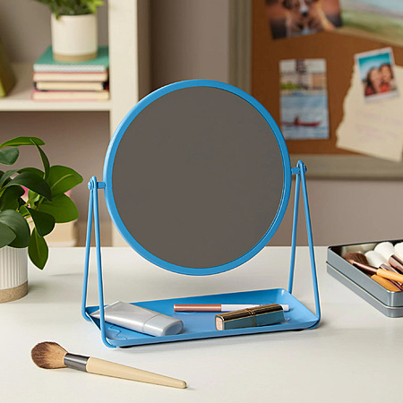 Walmart[walmart.com] has 9.65" Mainstays by Becky G. & Alejandra Round Tabletop Mirror w/ Metal Tray (Orange or Blue) for $4.86. The White is on sale for $5.03. Shipping is free w/ Walmart+ (free trial available[walmart.com]) or on orders $35+.