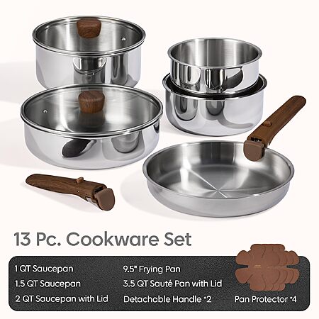 13-Piece CAROTE Tri-Ply Stainless Steel Cookware Set with Detachable Handles (Woodgrain Style) $64.99 + Free Shipping