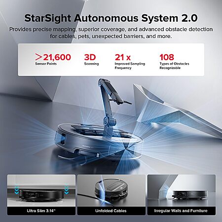StarSight 3D Navigation – Smarter, Safer, More Efficient: The Saros Z70 features the advanced StarSight Autonomous System 2.0, providing smart navigation and obstacle avoidance. Its VertiBeam Lateral Obstacle Avoidance technology enables the robot to accurately detect and navigate around obstacles like furniture legs, cables, and up to 108 other types of obstacles*. This ensures precise movement in complex layouts, delivering thorough and reliable cleaning coverage even in challenging environments