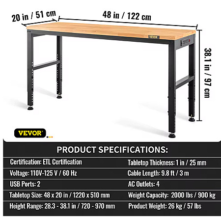 48" x 20" Vevor SucceBuy Height Adjustable Hardwood Top Workbench $89.27 + free s/h