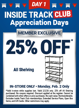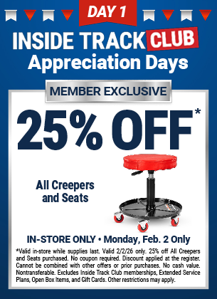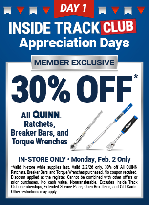 Harbor Freight ITC member appreciation days, Day 1, 2/2, 30% off Quinn ratchets/pry bars/torque wrenches, 25% off creepers and seats, 25% off shelving