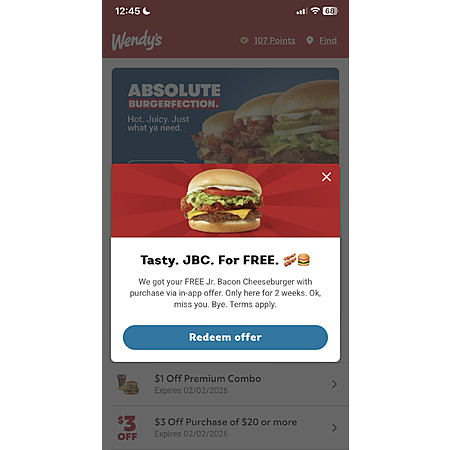 I opened the Wendy's app and it showed a message about a free Jr. Bacon Cheeseburger with purchase. The message said 'miss you' so it might just be for people who haven't used the app in a while. My last order was on Dec. 30. The offer isn't showing up in my list of offers yet but that usually doesn't happen until lunch time. It says expires in two weeks but probably only good once. I have a screenshot but don't know any more details yet. Big YMMV.