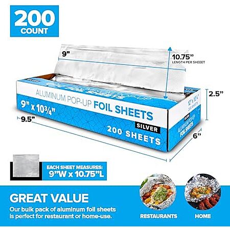 Model: 200 Count Pre-Cut Deli Aluminum Foil Sheets, 12” Pop Up Foil Sheets for Restaurant, Disposable Foil Sheets for Food, Tin Foil Sheets for Burrito, Hot Dog or Sandwich, Stock Your Home