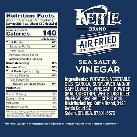 Amazon[amazon.com] has 6.5-Oz Kettle Brand Air Fried Potato Chips (Sea Salt and Vinegar) for $1.99 - 10% when you 'clip' the coupon on product page = $1.79. Shipping is free with Prime or on $35+ orders.