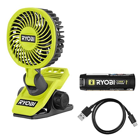 Model: RYOBI USB Lithium Clamp Fan Kit with 2.0 Ah USB Lithium Battery and Charging Cable