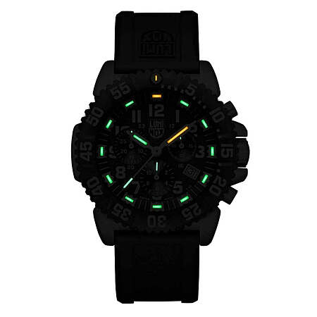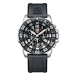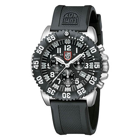 Check out this watch: Luminox 3181 Sea Colormark chronograph men's dive watch features a 44mm wide and 14mm thick solid stainless steel case with a 1-way diver rotating black bezel and textured security screw-on crown with function pushers. Luminox 3181 is powered by a precision Swiss T25 quartz chronograph movement.
