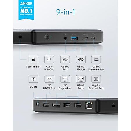Model: Anker USB C Docking Station, PowerExpand 9-in-1 USB-C PD Dock, 60W Charging for Laptop, 20W Power Delivery Charging, 4K HDMI and DisplayPort, USB 3.0 and USB 2.0 Data, Gigabit Ethernet, 3.5 mm Audio