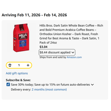 Model: Hills Bros. Dark Satin Whole Bean Coffee – Rich and Bold Premium Arabica Coffee Beans – Orthodox Union Kosher – Dark Roast, Fresh Grind for Best Aroma & Taste – Dark Satin, 1 Pack of 24oz