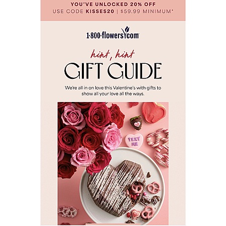 1800flowers.com 20% off Valentine’s gifts With code KISSES20