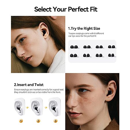 • Cloud-like Sleep Comfort & Fit: Made with ultra-soft silicone, earplugs for sleep reduces pressure on the ear, ensuring comfort - whether you're tossing, or side-sleeping. Innovative 3D ergonomic design molds to your ear canal, sleeping ear plugs providing a snug, secure fit—ideal for side sleepers, active concert-goers, or travelers. With 8 pair eartips (2 pairs XS, S, M, L), noise cancelling ear plugs fit 95% of ear shapes. Enjoy all-day comfort with our ear plugs for sleeping noise cancelling