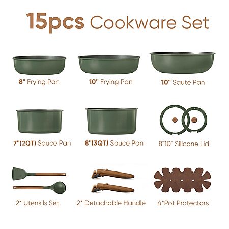 Prime Members: 15-Piece CAROTE Nonstick Cookware Set w/ Detachable Handles (Dark Green) $49.99 + Free Shipping