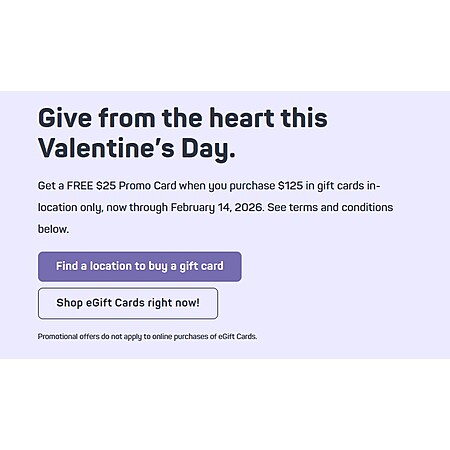Get a FREE $25 Promo Card when you purchase $125 in gift cards in-location only, now through February 14, 2026.