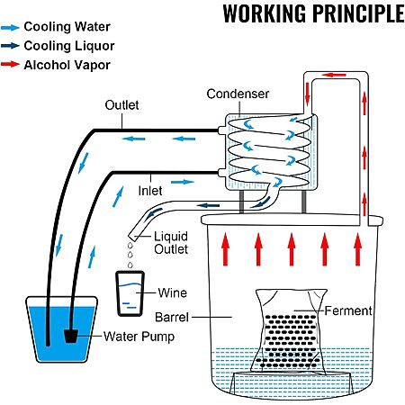 - EFFICIENT CONDENSATION TREATMENT: This alcohol kit adopts the red copper coiled-tube with rapid thermal conductivity assures promising cooling performance, together with a large contact area with the coolant, providing a rather low temperature of distilled product. During the condensation process, an additional circulating pump facilitates the expedited water flow of the condensing agent.