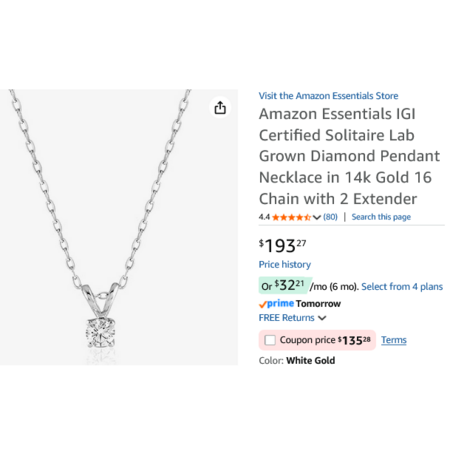 Amazon Essentials IGI Certified Solitaire 0.25 cttw Lab Grown Diamond Pendant Necklace in 14k White Gold 16 Chain w/2 Extender. YMMV - Coupon Price $135.28