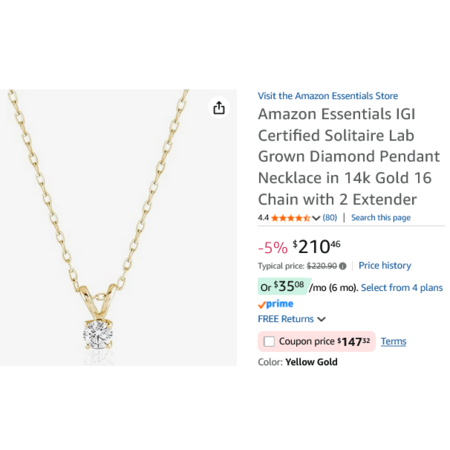 Amazon Essentials IGI Certified Solitaire 0.25 cttw Lab Grown Diamond Pendant Necklace in 14k Yellow Gold 16 Chain w/2 Extender. YMMV - Coupon Price $147.32