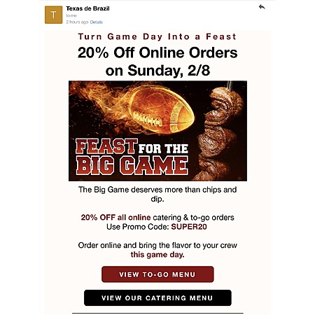 Texas de Brazil 20% Off Online To Go or Catering Orders on Sunday 02/08 Use Code SUPER20