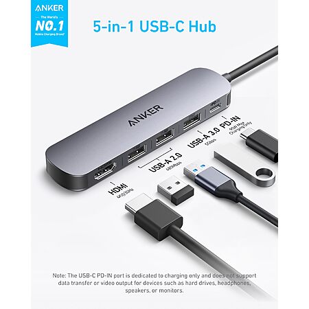 Anker USB C Hub, 5-in-1 USB Hub for Laptops, 4K HDMI Multiport Adapter with 90W Max Power Delivery, USBC & USBA Data Ports USB C Dongle $11.99